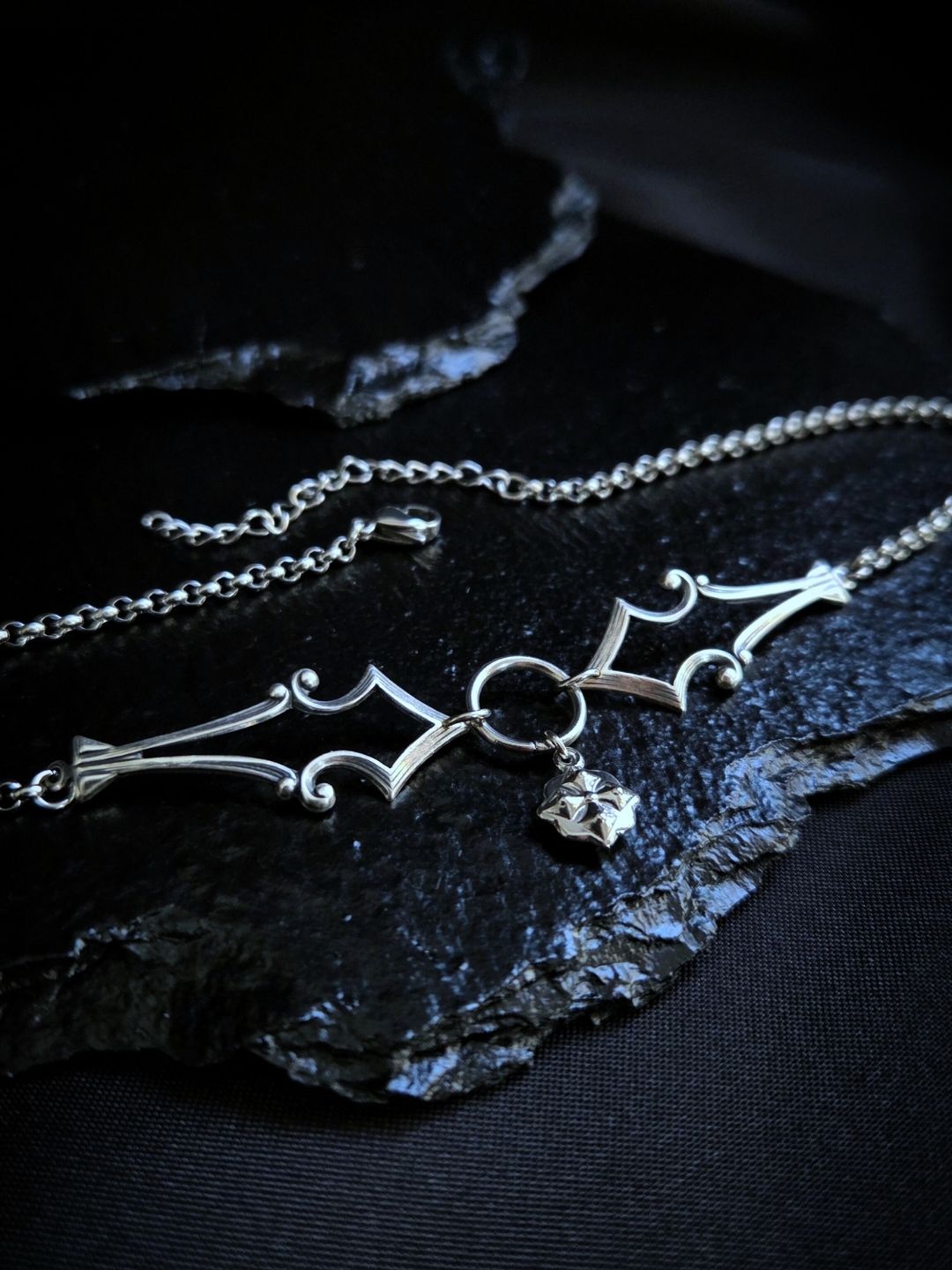 This necklace is all about refined strength, with delicate Fantasy armor-like details and a cross shield inspired pendant. It gives you that knightcore edge, but polished and elegant enough to wear every day.